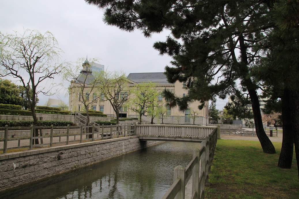 信濃川旧河道と、奥に見える建物が新潟市歴史博物館の本館です。