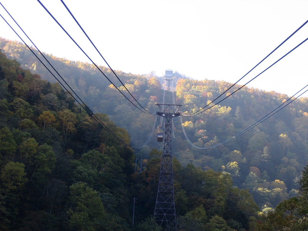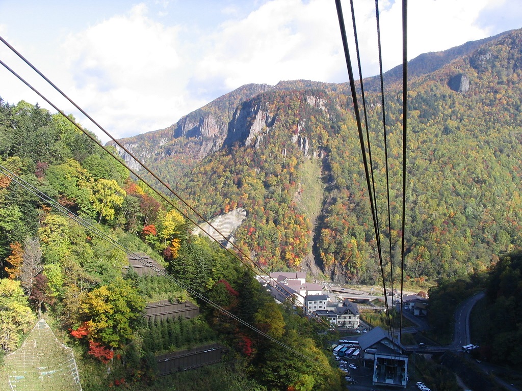 黒岳ロープウェイは、温泉街の中の山麓駅から、黒岳5合目を結ぶロープウェイです。黒岳5合目は標高1,300mほどですので、山麓との標高差は約600mほど。麓はこのような紅葉で十分綺麗ですが、上の方はどうでしょうか。