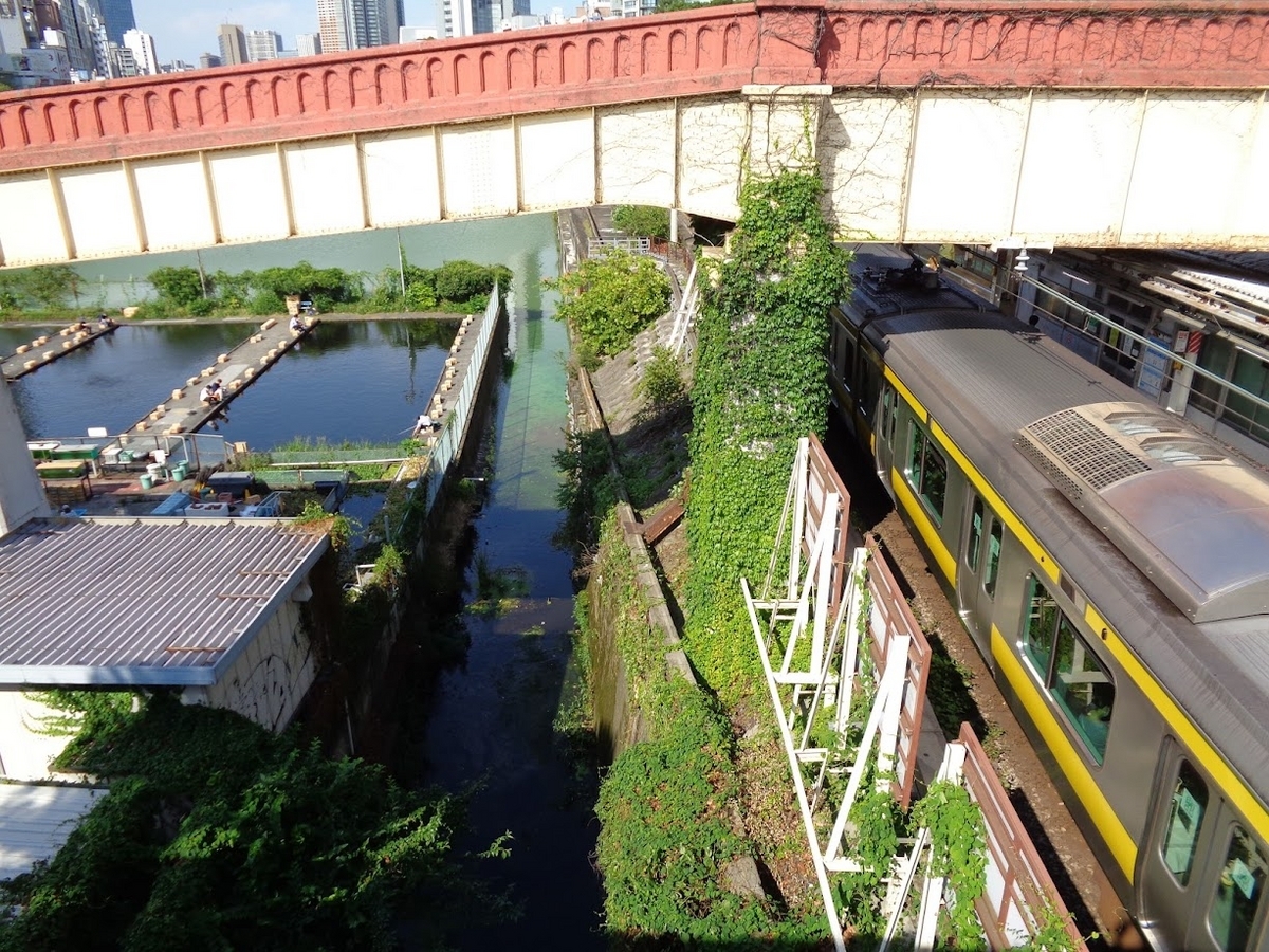 ただ、時間に余裕がありすぎたため、市ヶ谷駅で途中下車。数々のドラマなどで登場している、線路沿いの釣り堀に行ってみます。電車の横に釣り堀がある、独特の景色です。