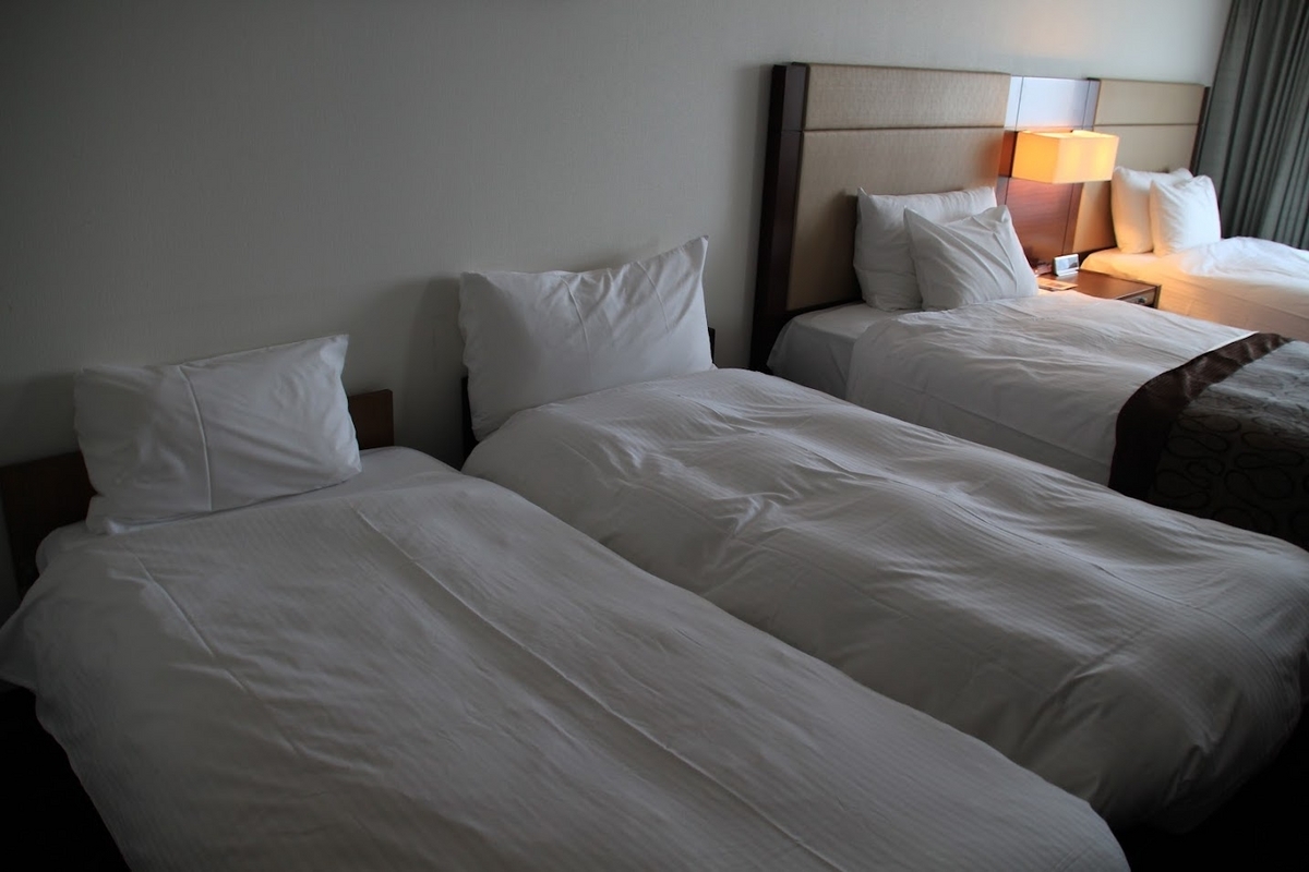 130cm×200cmのベッド2台とエキストラベッド2台を入れても、十分な広さがあります。そして、ベッドの寝心地が最高でした。ちょうど良い硬さでぐっすり安眠。
